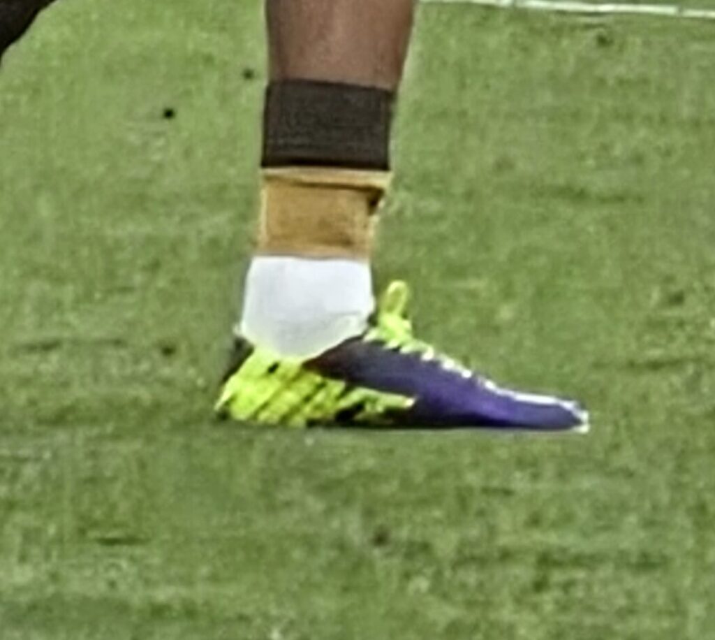 友人からいただいた写真が1枚目で、いかんせん試合中はわたくし、この席にいますので、声もちゃんと聞こえます。ちなみに真剣に写真を撮っていますが、その対象は選手のスパイクで、約10年以上前の懐かしいスパイクを履いていましたので、思わず。